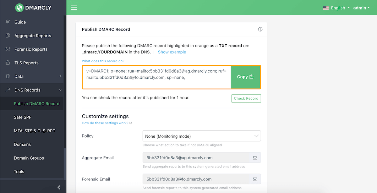 With a comprehensive set of tools at your disposal, you can generate/check DMARC/SPF/DKIM records, all in the dashboard.