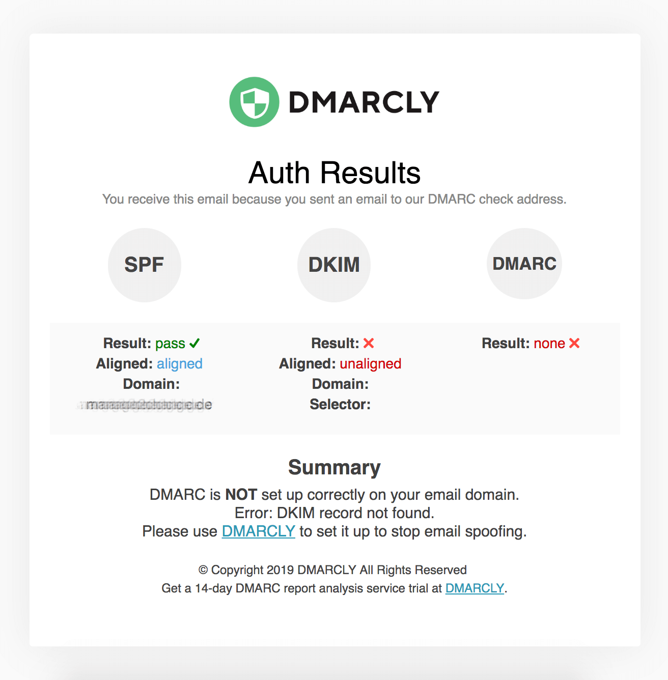 After we receive the email, we will perform an SPF/DKIM/DMARC authentication analysis on the sender domain and send the results back to you as a report.