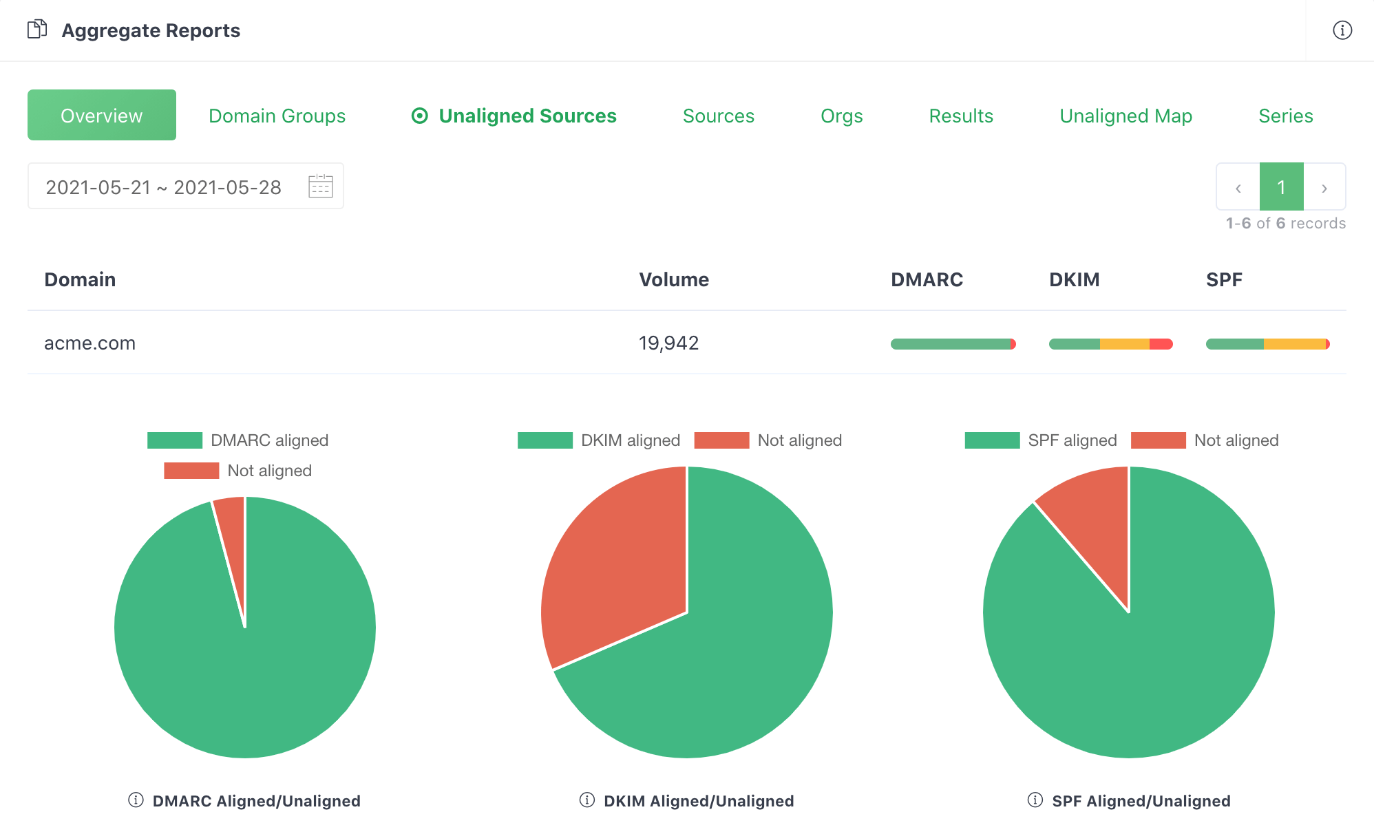 View DMARC aggregate data from various dimensions including domain, source, organization, result, country, etc.